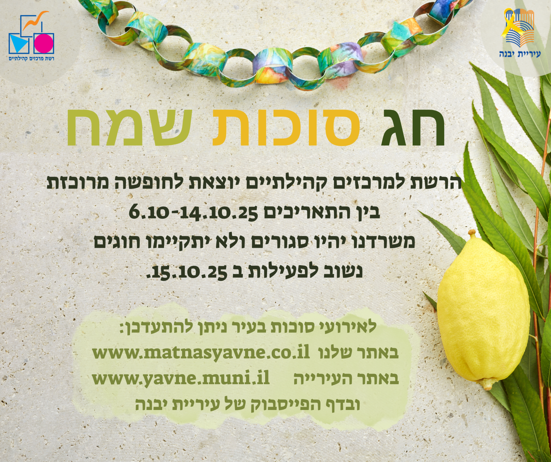 הרשת למרכזים קהילתיים יבנה יוצאת לחופשה מרוכזת. החל מיום שני 05.10.25 ועד יום שלישי 14.10.25 הפעילות בכלל המרכזים תתחדש ביום רביעי 15.10.25