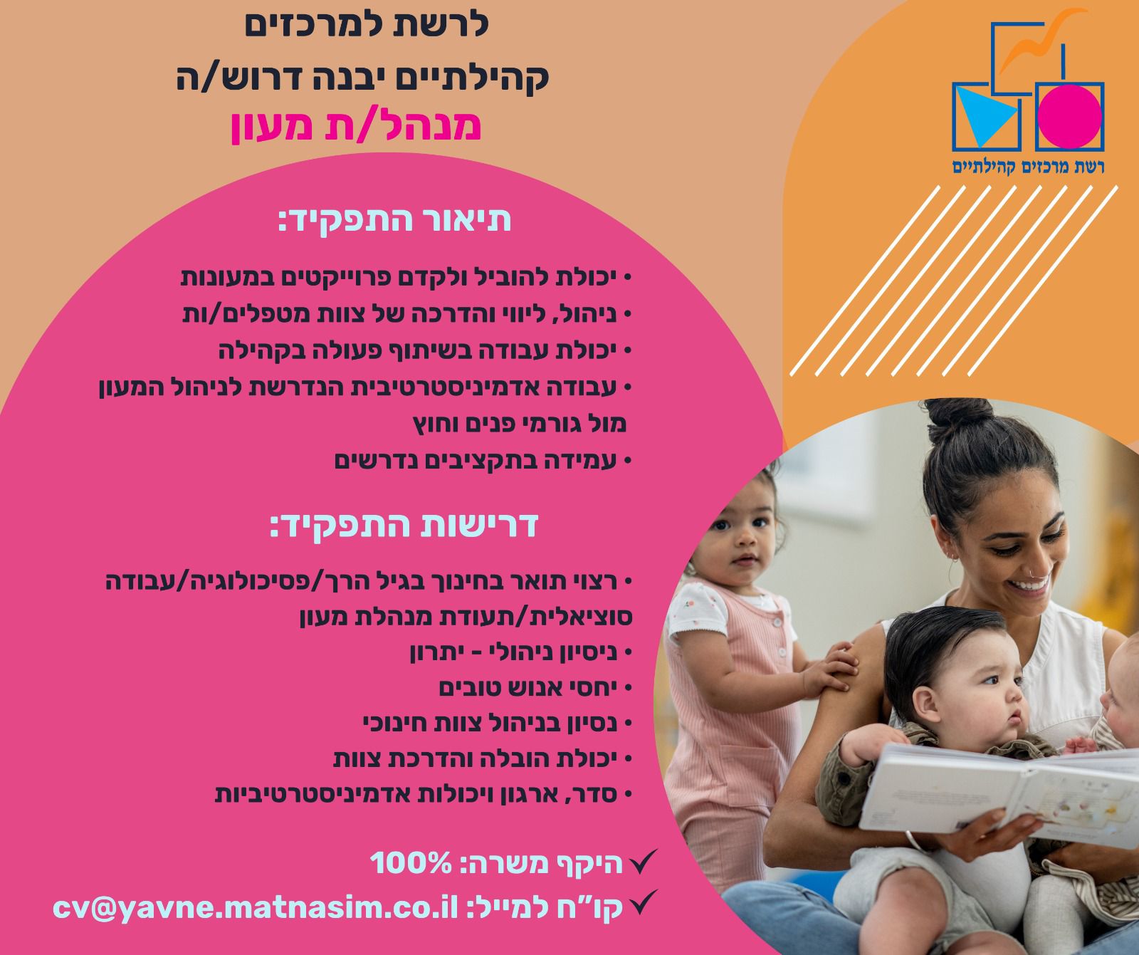 דרוש/ה מנהל/ת מעון – רשת המרכזים הקהילתיים יבנה